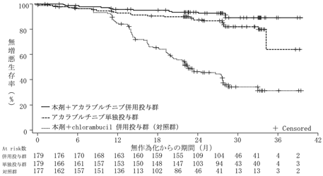 未治療のCD20陽性の慢性リンパ性白血病患者注5)535例を対象に、本剤+アカラブルチニブ併用投与注6)、及びアカラブルチニブ1回100mgを1日2回投与するアカラブルチニブ単独投与の有効性及び安全性を本剤+chlorambucil注7)併用投与(対照群)注8)と比較する非盲検無作為化第Ⅲ相試験を実施した。独立評価委員会判定による無増悪生存期間の中間解析の結果、本剤+アカラブルチニブ併用投与群は対照群と比較して、統計学的に有意な延長を示した(主要評価項目:ハザード比0.10、95%信頼区間0.06~0.17、p<0.0001)。無増悪生存期間の中央値は、本剤+アカラブルチニブ併用投与群で未到達、対照群で22.6カ月であった(2019年2月8日データカットオフ)6)。