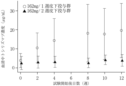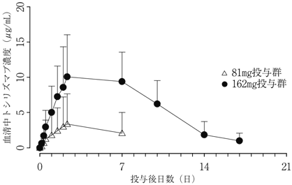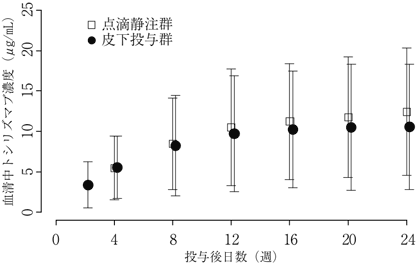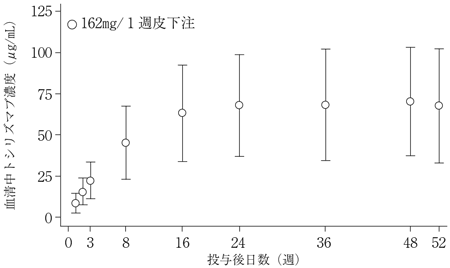 関節リウマチ患者を対象にトシリズマブ81mg又は162mg注1)を腹部に皮下投与した。血清中トシリズマブ濃度推移を図1、薬物動態パラメータを表1に示した10)。