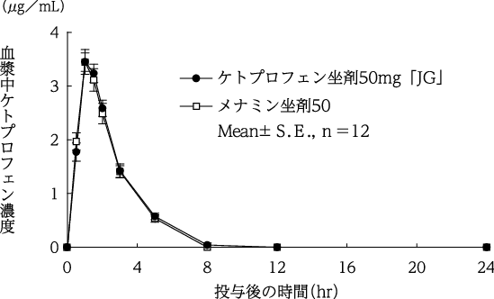 ケトプロフェン坐剤50mg「JG」とメナミン坐剤50を、クロスオーバー法によりそれぞれ1個(ケトプロフェンとして50mg)健康成人男子に空腹時直腸内投与して血漿中ケトプロフェン濃度を測定し、得られた薬物動態パラメータ(AUC、Cmax)について統計解析を行った結果、両剤の生物学的同等性が確認された6)。