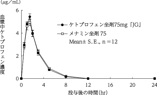 ケトプロフェン坐剤75mg「JG」とメナミン坐剤75を、クロスオーバー法によりそれぞれ1個(ケトプロフェンとして75mg)健康成人男子に空腹時直腸内投与して血漿中ケトプロフェン濃度を測定し、得られた薬物動態パラメータ(AUC、Cmax)について統計解析を行った結果、両剤の生物学的同等性が確認された7)。