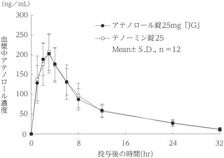 アテノロール錠25mg「JG」とテノーミン錠25を、クロスオーバー法によりそれぞれ2錠(アテノロールとして50mg)健康成人に空腹時単回経口投与して血漿中アテノロール濃度を測定し、得られた薬物動態パラメータ(AUC、Cmax)について統計解析を行った結果、両剤の生物学的同等性が確認された1)。
