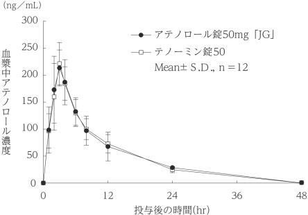 アテノロール錠50mg「JG」とテノーミン錠50を、クロスオーバー法によりそれぞれ1錠(アテノロールとして50mg)健康成人男子に空腹時単回経口投与して血漿中アテノロール濃度を測定し、得られた薬物動態パラメータ(AUC、Cmax)について統計解析を行った結果、両剤の生物学的同等性が確認された2)。