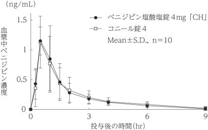 ベニジピン塩酸塩錠4mg「CH」とコニール錠4を、クロスオーバー法によりそれぞれ1錠(ベニジピン塩酸塩として4mg)健康成人男子に空腹時単回経口投与して血漿中ベニジピン濃度を測定し、得られた薬物動態パラメータ(AUC、Cmax)について90%信頼区間法にて統計解析を行った結果、log(0.80)~log(1.25)の範囲内であり、両剤の生物学的同等性が確認された2)。