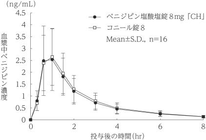 ベニジピン塩酸塩錠8mg「CH」とコニール錠8を、クロスオーバー法によりそれぞれ1錠(ベニジピン塩酸塩として8mg)健康成人男子に空腹時単回経口投与して血漿中ベニジピン濃度を測定し、得られた薬物動態パラメータ(AUC、Cmax)について90%信頼区間法にて統計解析を行った結果、log(0.80)~log(1.25)の範囲内であり、両剤の生物学的同等性が確認された3)。