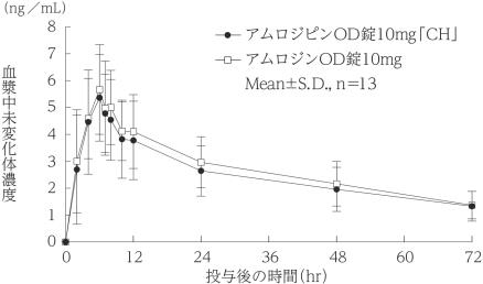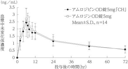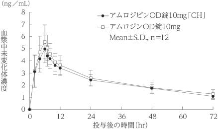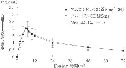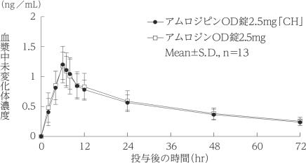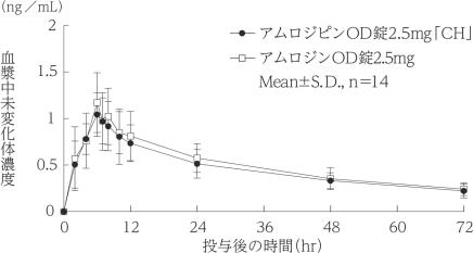 アムロジピンOD錠2.5mg「CH」とアムロジンOD錠2.5mgを、クロスオーバー法によりそれぞれ1錠(アムロジピンとして2.5mg)健康成人男子に空腹時単回経口投与して血漿中未変化体濃度を測定し、得られた薬物動態パラメータ(AUC、Cmax)について90%信頼区間法にて統計解析を行った結果、log(0.80)~log(1.25)の範囲内であり、両剤の生物学的同等性が確認された8)。