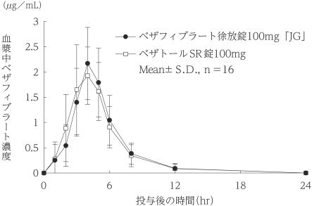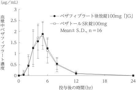 ベザフィブラート徐放錠100mg「JG」とベザトールSR錠100mgを、クロスオーバー法によりそれぞれ1錠(ベザフィブラートとして100mg)健康成人男子に食後単回経口投与して血漿中ベザフィブラート濃度を測定し、得られた薬物動態パラメータ(AUC、Cmax)について統計解析を行った結果、両剤の生物学的同等性が確認された2)。