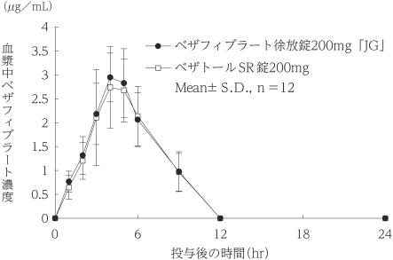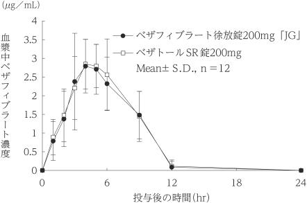 ベザフィブラート徐放錠200mg「JG」とベザトールSR錠200mgを、クロスオーバー法によりそれぞれ1錠(ベザフィブラートとして200mg)健康成人男子に食後単回経口投与して血漿中ベザフィブラート濃度を測定し、得られた薬物動態パラメータ(AUC、Cmax)について統計解析を行った結果、両剤の生物学的同等性が確認された3)。