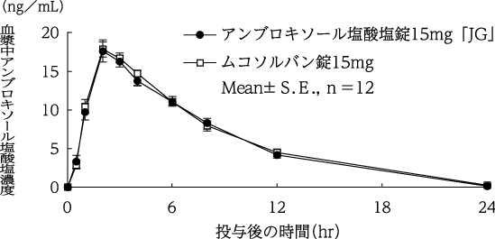 アンブロキソール塩酸塩錠15mg「JG」とムコソルバン錠15mgを、クロスオーバー法によりそれぞれ1錠(アンブロキソール塩酸塩として15mg)健康成人男子に空腹時単回経口投与して血漿中アンブロキソール塩酸塩濃度を測定し、得られた薬物動態パラメータ(AUC、Cmax)について統計解析を行った結果、両剤の生物学的同等性が確認された1)。