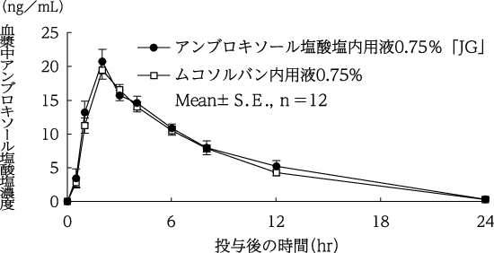 アンブロキソール塩酸塩内用液0.75%「JG」とムコソルバン内用液0.75%を、クロスオーバー法によりそれぞれ2mL(アンブロキソール塩酸塩として15mg)健康成人男子に空腹時単回経口投与して血漿中アンブロキソール塩酸塩濃度を測定し、得られた薬物動態パラメータ(AUC、Cmax)について統計解析を行った結果、両剤の生物学的同等性が確認された1)。