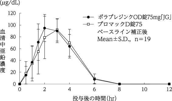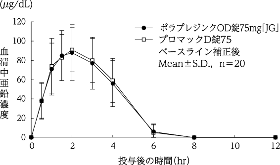 ポラプレジンクOD錠75mg「JG」とプロマックD錠75を、クロスオーバー法によりそれぞれ1錠(ポラプレジンクとして75mg)健康成人男子に空腹時単回経口投与(水なしで服用及び水で服用)して血清中亜鉛濃度を測定※し、得られた薬物動態パラメータ(AUC、Cmax)について90%信頼区間法にて統計解析を行った結果、log(0.80)~log(1.25)の範囲内であり、両剤の生物学的同等性が確認された1)。〔※投与前の血清中亜鉛濃度でベースライン補正後測定〕