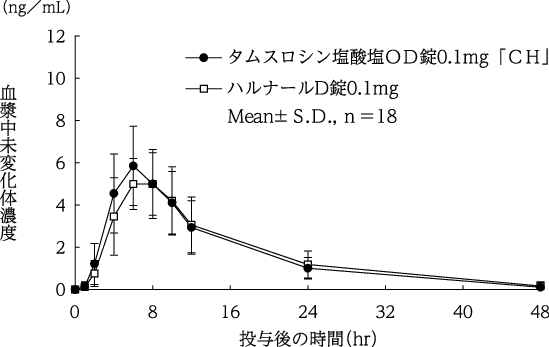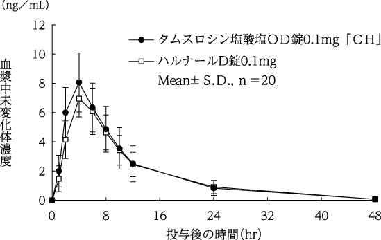 タムスロシン塩酸塩OD錠0.1mg「CH」とハルナールD錠0.1mgを、クロスオーバー法によりそれぞれ2錠(タムスロシン塩酸塩として0.2mg)健康成人男子に単回経口投与(空腹時-水で服用、空腹時-水なしで服用及び食後-水なしで服用)して血漿中未変化体濃度を測定し、得られた薬物動態パラメータ(AUC、Cmax)について90%信頼区間法にて統計解析を行った結果、log(0.80)~log(1.25)の範囲内であり、両剤の生物学的同等性が確認された6)。