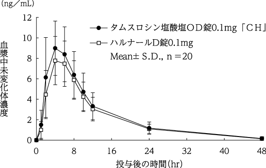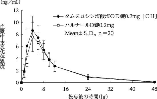 タムスロシン塩酸塩OD錠0.2mg「CH」とハルナールD錠0.2mgを、クロスオーバー法によりそれぞれ1錠(タムスロシン塩酸塩として0.2mg)健康成人男子に単回経口投与(空腹時-水で服用、空腹時-水なしで服用及び食後-水なしで服用)して血漿中未変化体濃度を測定し、得られた薬物動態パラメータ(AUC、Cmax)について90%信頼区間法にて統計解析を行った結果、log(0.80)~log(1.25)の範囲内であり、両剤の生物学的同等性が確認された7)。