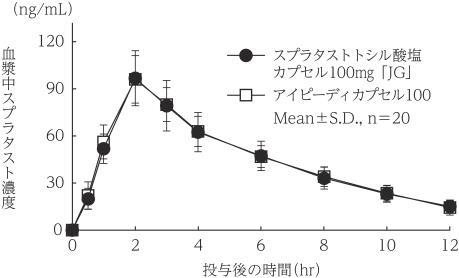 スプラタストトシル酸塩カプセル100mg「JG」とアイピーディカプセル100を、クロスオーバー法によりそれぞれ1カプセル(スプラタストトシル酸塩として100mg)健康成人男子に空腹時単回経口投与して血漿中スプラタスト濃度を測定し、得られた薬物動態パラメータ(AUC、Cmax)について90%信頼区間法にて統計解析を行った結果、log(0.80)~log(1.25)の範囲内であり、両剤の生物学的同等性が確認された3)。