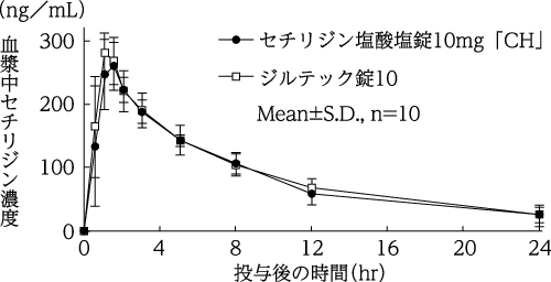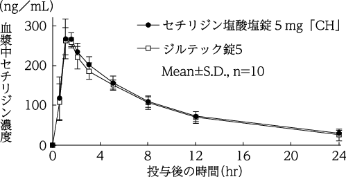 セチリジン塩酸塩錠5mg「CH」とジルテック錠5を、クロスオーバー法によりそれぞれ2錠(セチリジン塩酸塩として10mg)健康成人男子に空腹時単回経口投与して血漿中セチリジン濃度を測定し、得られた薬物動態パラメータ(AUC、Cmax)について90%信頼区間法にて統計解析を行った結果、log(0.80)~log(1.25)の範囲内であり、両剤の生物学的同等性が確認された3)。