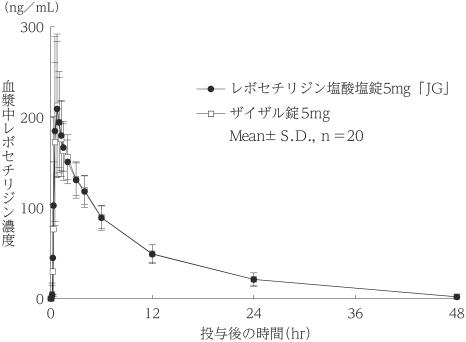 レボセチリジン塩酸塩錠5mg「JG」とザイザル錠5mgを、クロスオーバー法によりそれぞれ1錠(レボセチリジン塩酸塩として5mg)健康成人男子に空腹時単回経口投与して血漿中レボセチリジン濃度を測定し、得られた薬物動態パラメータ(AUC、Cmax)について90%信頼区間法にて統計解析を行った結果、log(0.80)~log(1.25)の範囲内であり、両剤の生物学的同等性が確認された4)。