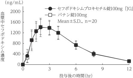 セフポドキシムプロキセチル錠100mg「JG」とバナン錠100mgを、クロスオーバー法によりそれぞれ1錠(セフポドキシム プロキセチルとして100mg(力価))健康成人男子に空腹時単回経口投与して血漿中セフポドキシム濃度を測定し、得られた薬物動態パラメータ(AUC、Cmax)について90%信頼区間法にて統計解析を行った結果、log(0.80)~log(1.25)の範囲内であり、両剤の生物学的同等性が確認された4)。