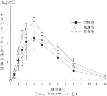 健康成人男性6名にセフポドキシム プロキセチル錠200mgを空腹時又は軽食あるいは重食30分後に単回経口投与したときのセフポドキシムの最高血清中濃度は投与後2.6~3.5時間で得られ、それぞれ2.1μg/mL、3.0μg/mL、2.7μg/mLの濃度を示した。また、AUC0-12はそれぞれ12.5μg・hr/mL、16.9μg・hr/mL、14.8μg・hr/mLであり、空腹時より食後で吸収は良好であった。血清中濃度の半減期は空腹時、食後の影響はなく、約2時間であった5)。
