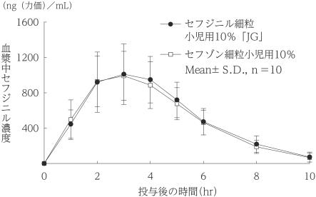 セフジニル細粒小児用10%「JG」とセフゾン細粒小児用10%を、クロスオーバー法によりそれぞれ1g(セフジニルとして100mg(力価))健康成人男子に空腹時単回経口投与して血漿中セフジニル濃度を測定し、得られた薬物動態パラメータ(AUC、Cmax)について90%信頼区間法にて統計解析を行った結果、log(0.80)~log(1.25)の範囲内であり、両剤の生物学的同等性が確認された3)。