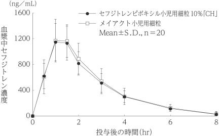 セフジトレンピボキシル小児用細粒10%「CH」とメイアクト小児用細粒を、クロスオーバー法によりそれぞれ1g(セフジトレン ピボキシルとして100mg(力価))健康成人男子に空腹時単回経口投与して血漿中セフジトレン濃度を測定し、得られた薬物動態パラメータ(AUC、Cmax)について90%信頼区間法にて統計解析を行った結果、log(0.80)~log(1.25)の範囲内であり、両剤の生物学的同等性が確認された4)。