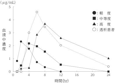 腎機能障害患者及び人工透析導入患者(いずれも成人)に200mgを食後単回経口投与した場合、セフジトレンの血清中濃度・薬物動態パラメータは、図1・表2のとおりであり、いずれの場合も高値で推移し、腎機能の障害の程度に応じたT1/2の遅延が認められた。また、尿中排泄率は腎機能の障害の程度が大きくなるにつれて低下し、排泄の遅延が認められた13)。,