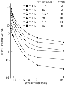 用量並びに投与間隔に留意するなど患者の状態を観察しながら慎重に投与すること。一般に生理機能(骨髄機能、肝機能、腎機能等)が低下している。
