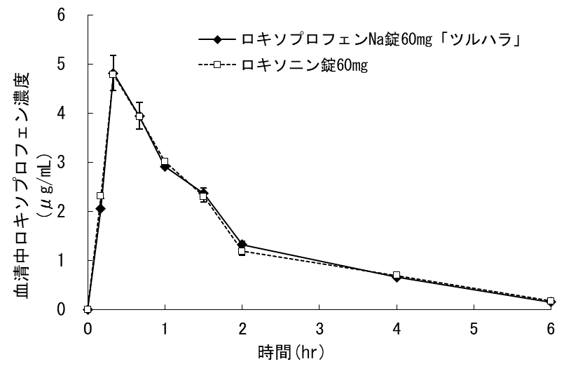 健康成人男性16例にロキソプロフェンナトリウム錠60mgを単回経口投与したところ、速やかに吸収され、血中にはロキソプロフェン(未変化体)のほか、trans-OH体(活性代謝物)の型で存在した。最高血漿中濃度に到達する時間はロキソプロフェンで約30分、trans-OH体で約50分であり、半減期はいずれも約1時間15分であった2)。