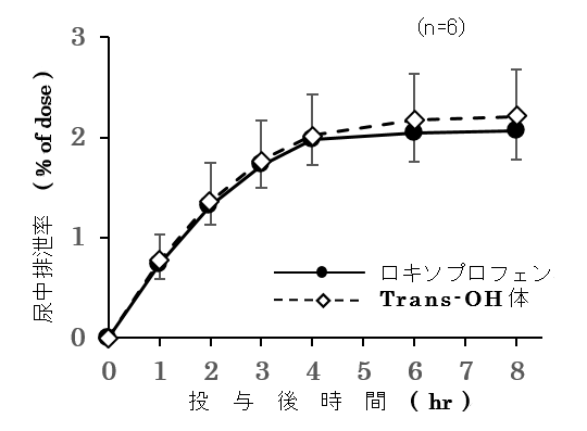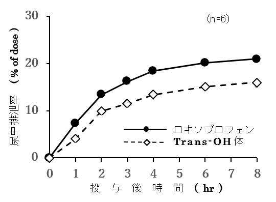 健康成人男性6例にロキソプロフェンナトリウム錠60mgを単回経口投与したとき、尿中への排泄は速やかで、尿中に排泄された大部分がロキソプロフェン又はtrans-OH体のグルクロン酸抱合体であった2)。ロキソプロフェンナトリウム錠60mg単回経口投与後の尿中排泄遊離型グルクロン酸抱合型