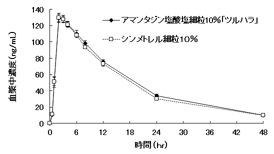 アマンタジン塩酸塩細粒10%「ツルハラ」とシンメトレル細粒10%を、クロスオーバー法によりそれぞれ 0.5g(アマンタジン塩酸塩 50mg)健康成人男子に絶食時単回経口投与して血漿中未変化体濃度を測定し、得られた薬物動態パラメータ(AUC、Cmax)について 90%信頼区間法にて統計解析を行った結果、log(0.8)~log(1.25)の範囲内であり、両剤の生物学的同等性が確認された7)。