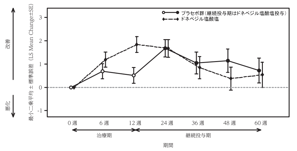 本試験では、認知機能障害、精神症状・行動障害の両症状に対するドネペジル塩酸塩の有効性がプラセボに比較して優れているという検証仮説は検証されていない20)。