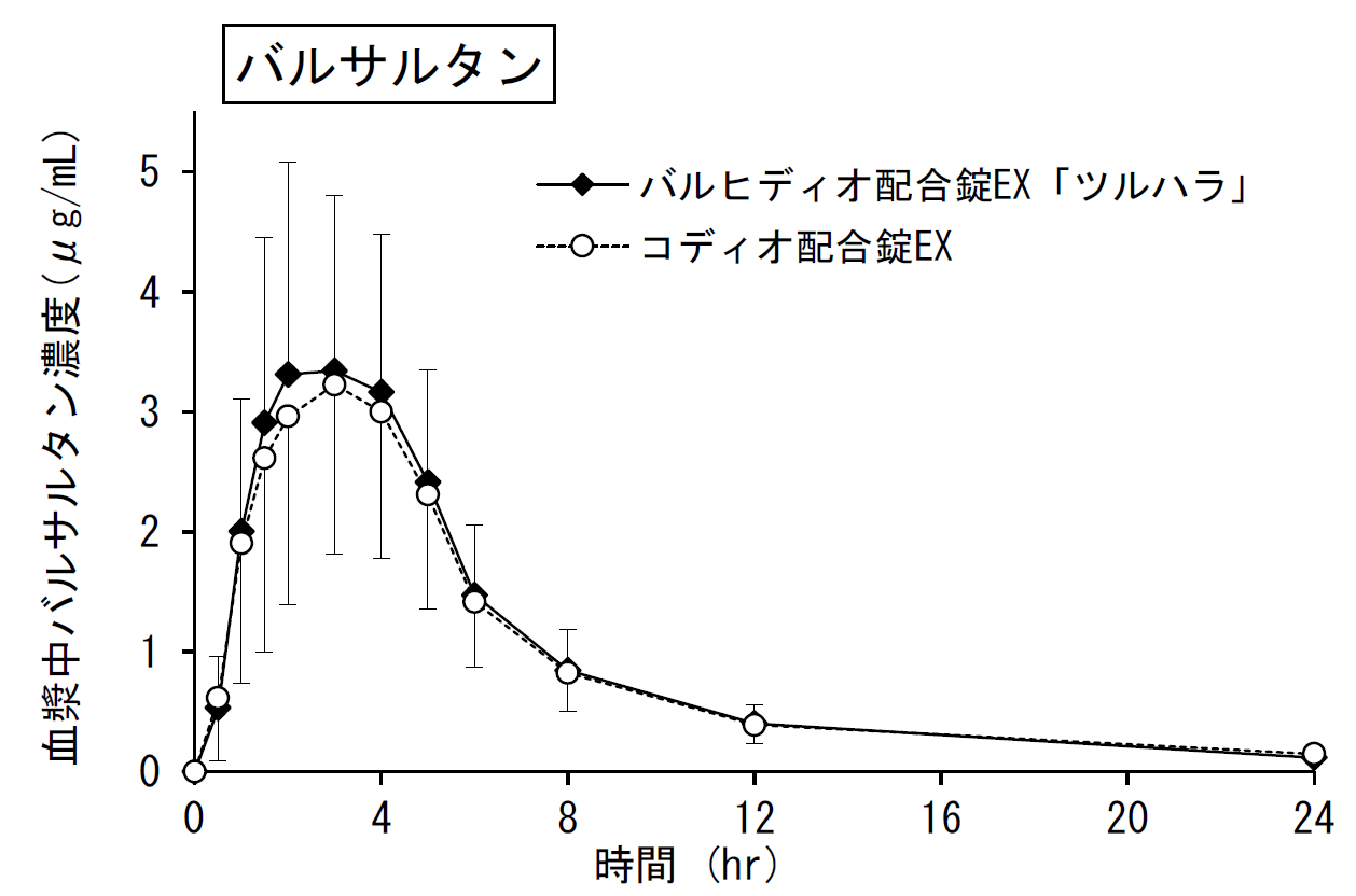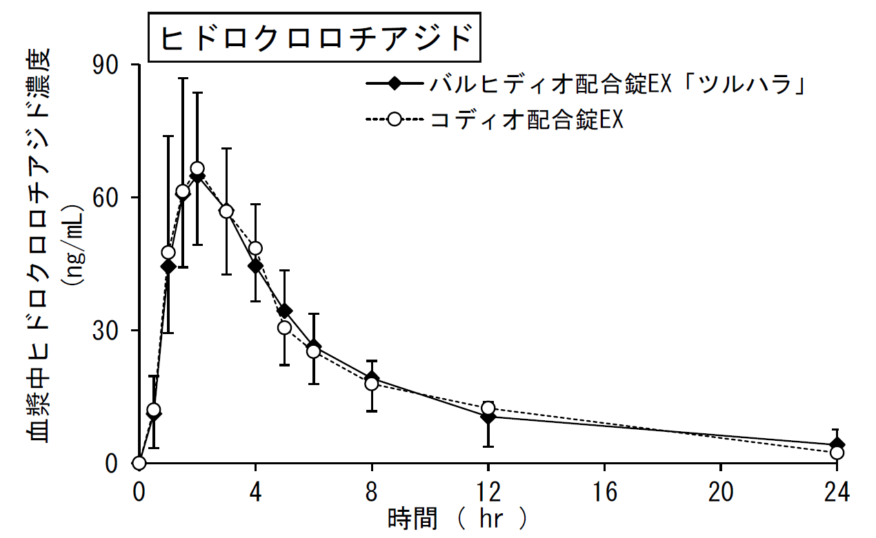 バルヒディオ 配合錠MD「ツルハラ」 は溶出挙動に基づき、バルヒディオ 配合錠EX「ツルハラ」 と生物学的に同等とみなされた22) 。