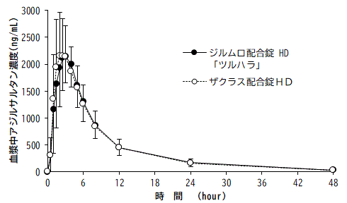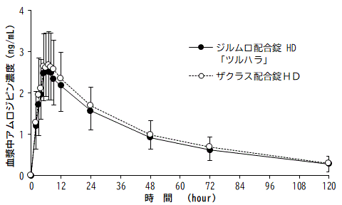 ジルムロ配合錠HD「ツルハラ」とザクラス配合錠HDを、クロスオーバー法によりそれぞれ1錠(アジルサルタン20mg、アムロジピンベシル酸塩をアムロジピンとして5mg)を健康成人男子に絶食時単回経口投与してそれぞれの血漿中未変化体濃度を測定し、得られた薬物動態パラメータ(AUC、Cmax)について90%信頼区間法にて統計解析を行った結果、log(0.8)~log(1.25)の範囲内であり、両剤の生物学的同等性が確認された8)。
