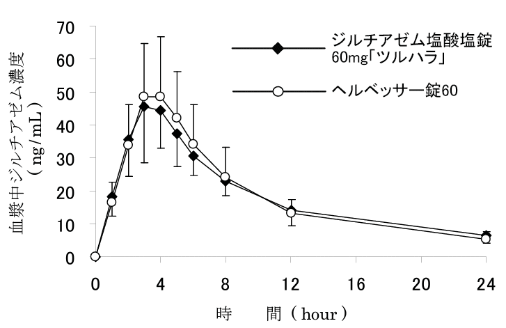 ジルチアゼム塩酸塩錠60mg「ツルハラ」とヘルベッサー錠60をクロスオーバー法によりそれぞれ1錠(ジルチアゼム塩酸塩として60mg)を健康成人男子に絶食時単回経口投与して血漿中未変化体濃度を測定し、得られた薬物動態パラメータ(AUC、Cmax)について90%信頼区間法にて統計解析を行った結果、log(0.8)~log(1.25)の範囲内であり、両剤の生物学的同等性が確認された2)。