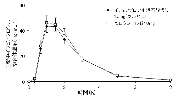 イフェンプロジル酒石酸塩錠10mg「ツルハラ」とセロクラール錠10mgを、クロスオーバー法によりそれぞれ4錠(イフェンプロジル酒石酸塩40mg注1))を健康成人男子に絶食時単回経口投与して血漿中抱合体濃度を測定し、得られた薬物動態パラメータ(AUC、Cmax)について90%信頼区間法にて統計解析を行った結果、log(0.8)~log(1.25)の範囲内であり、両剤の生物学的同等性が確認された1)。