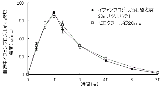 イフェンプロジル酒石酸塩錠20mg「ツルハラ」とセロクラール錠20mgを、クロスオーバー法によりそれぞれ1錠(イフェンプロジル酒石酸塩20mg)を健康成人男子に摂食時単回経口投与して血漿中未変化体濃度を測定し、得られた薬物動態パラメータ(AUC、Cmax)について90%信頼区間法にて統計解析を行った結果、log(0.8)~log(1.25)の範囲内であり、両剤の生物学的同等性が確認された2)。