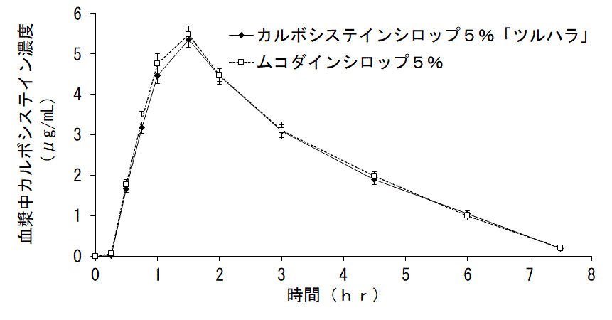カルボシステインシロップ5%「ツルハラ」とムコダインシロップ5%を、クロスオーバー法によりそれぞれ 10mL(L-カルボシステインとして500mg)を健康成人男子に絶食時単回経口投与して血漿中未変化体濃度を測定し、得られた薬物動態パラメータ(AUC、Cmax)について 90%信頼区間法にて統計解析を行った結果、log(0.8)~log(1.25)の範囲内であり、両剤の生物学的同等性が確認された1)。
