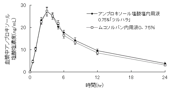 アンブロキソール塩酸塩内用液 0.75%「ツルハラ」とムコソルバン内用液0.75%を、クロスオーバー法によりそれぞれ 4mL(アンブロキソール塩酸塩として30mg:アンブロキソール塩酸塩内用液 0.75%「ツルハラ」の用法・用量は通常 1 回アンブロキソール塩酸塩として15mg)を健康成人男子に絶食時単回経口投与して血漿中未変化体濃度を測定し、得られた薬物動態パラメータ(AUC、Cmax)について 90%信頼区間法にて統計解析を行った結果、log(0.8)~log(1.25)の範囲内であり、両剤の生物学的同等性が確認された1)。