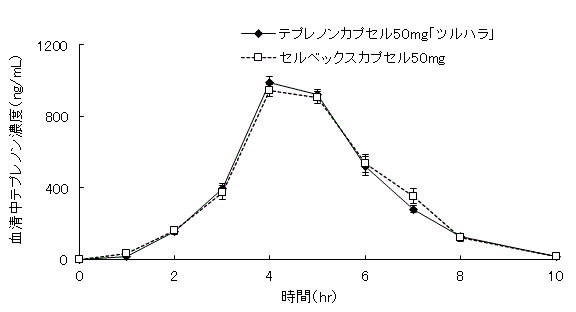 テプレノンカプセル50mg「ツルハラ」とセルベックスカプセル50mgをクロスオーバー法により、テプレノンとして 150mg注)(3 カプセル)を健康成人男子に食後単回経口投与して血清中未変化体濃度を測定し、得られた薬物動態パラメータ(AUC、Cmax)について 90%信頼区間法にて統計解析を行った結果、log(0.8)~log(1.25)の範囲内であり、両剤の生物学的同等性が確認された1)。注)1回 150mg投与は承認外用量