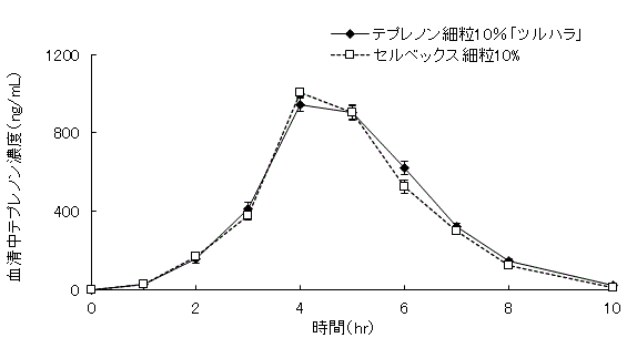 テプレノン細粒10%「ツルハラ」とセルベックス細粒10%をクロスオーバー法により、テプレノンとして 150mg注)(1.5g)を健康成人男子に食後単回経口投与して血清中未変化体濃度を測定し、得られた薬物動態パラメータ(AUC、Cmax)について 90%信頼区間法にて統計解析を行った結果、log(0.8)~log(1.25)の範囲内であり、両剤の生物学的同等性が確認された2)。注)1回 150mg投与は承認外用量