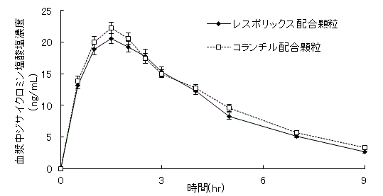 レスポリックス配合顆粒とコランチル配合顆粒を、クロスオーバー法によりそれぞれ2gを健康成人男子に絶食時単回経口投与して血漿中ジサイクロミン塩酸塩濃度を測定し、得られた薬物動態パラメータ(AUC、Cmax)について90%信頼区間法にて統計解析を行った結果、log(0.8)~log(1.25)の範囲内であり、両剤の生物学的同等性が確認された1)。