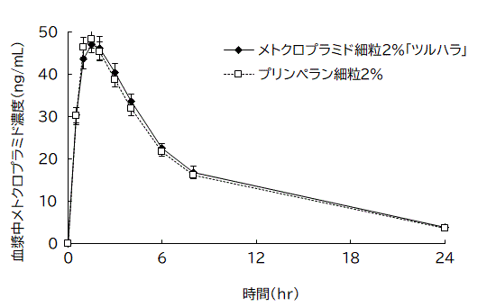 メトクロプラミド細粒2%「ツルハラ」とプリンペラン細粒2%をクロスオーバー法により、各1g(メトクロプラミドとして15.35mg)を健康成人男子に絶食時単回経口投与して血漿中未変化体濃度を測定し、得られた薬物動態パラメータ(AUC、Cmax)について90%信頼区間法にて統計解析を行った結果、log(0.8)~log(1.25)の範囲内であり、両剤の生物学的同等性が確認された2)。