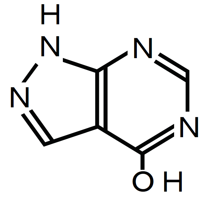 アロプリノールは、キサンチンオキシダーゼに対して、ヒポキサンチン及びキサンチンと拮抗することによって尿酸の生合成を抑制し、その結果血中尿酸値及び尿中尿酸値を低下させる9),10),11),12) 。また、アロプリノールの主代謝物であるオキシプリノールもキサンチンオキシダーゼ抑制作用を有する13),14)。