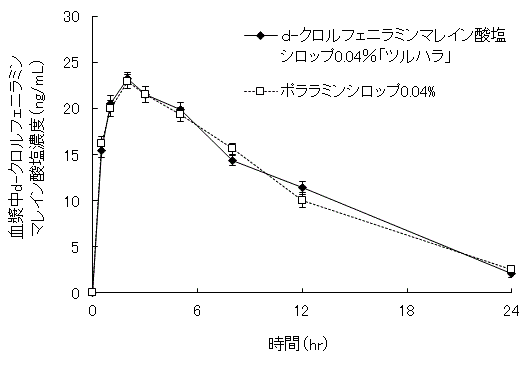d -クロルフェニラミンマレイン酸塩シロップ0.04%「ツルハラ」とポララミンシロップ0.04%を、クロスオーバー法によりそれぞれ20mL(d‐クロルフェニラミンマレイン酸塩として8mg*)を健康成人男子に絶食時単回経口投与して血漿中未変化体濃度を測定し、得られた薬物動態パラメータ(AUC、Cmax)について90%信頼区間法にて統計解析を行った結果、log(0.8)~log(1.25)の範囲内であり、両剤の生物学的同等性が確認された4)。(*:本剤の承認された1回用量はd‐クロルフェニラミンマレイン酸塩として2mgである)