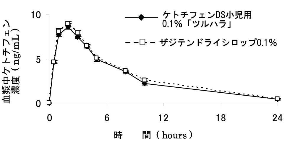 ケトチフェンDS小児用0.1%「ツルハラ」とザジテンドライシロップ0.1%をクロスオーバー法により、ケトチフェンとして2mg注)を健康成人男子に絶食時単回経口投与して血漿中総ケトチフェン濃度を測定し、得られた薬物動態パラメータ(AUC、Cmax)について90%信頼区間法にて統計解析を行った結果、log(0.8)~log(1.25)の範囲内であり、両剤の生物学的同等性が確認された4)。