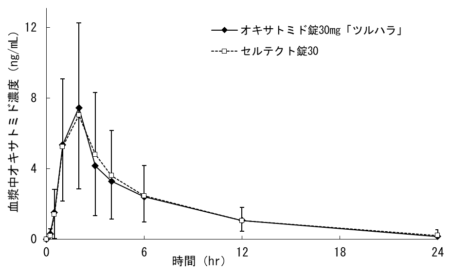 オキサトミド錠30mg「ツルハラ」とセルテクト錠30を、クロスオーバー法によりそれぞれ1 錠(オキサトミド30mg)を健康成人男子に絶食時単回経口投与して血漿中未変化体濃度を測定し、得られた薬物動態パラメータ(AUC、Cmax)について90%信頼区間法にて統計解析を行った結果、log(0.8)~log(1.25)の範囲内であり、両剤の生物学的同等性が確認された3)。