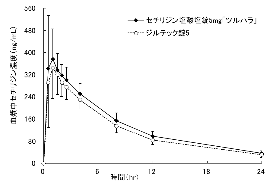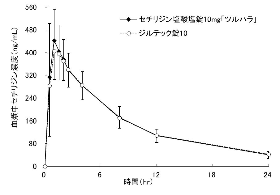 健康成人にセチリジン塩酸塩錠10mgを単回経口投与した場合、速やかに吸収され、投与約1.4時間後に最高血漿中濃度(Cmax)214.5ng/mLに達し、血漿中濃度消失半減期は約7時間であった。また、20mgを単回経口投与した場合、投与量の増加に伴ってCmaxの上昇、AUCの増大が認められた。健康成人に1日1回20mgを7日間連続経口投与した場合、蓄積性は認められなかった1)。