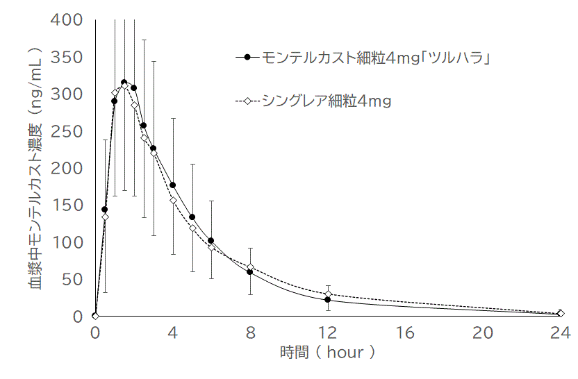 モンテルカスト細粒4mg「ツルハラ」とシングレア細粒4mgを、クロスオーバー法によりそれぞれ1包(モンテルカストとして4mg)を健康成人男子に絶食時単回経口投与して血漿中未変化体濃度を測定し、得られた薬物動態パラメータ(AUC、Cmax)について90%信頼区間法にて統計解析を行った結果、log(0.8)~log(1.25)の範囲内であり、両剤の生物学的同等性が確認された9)。
