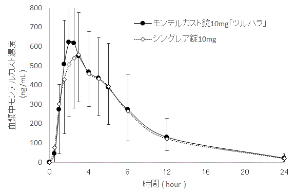 モンテルカスト錠10mg「ツルハラ」とシングレア錠10mgを、クロスオーバー法によりそれぞれ1錠(モンテルカストとして10mg)を健康成人男子に絶食時単回経口投与して血漿中未変化体濃度を測定し、得られた薬物動態パラメータ(AUC、Cmax)について90%信頼区間法にて統計解析を行った結果、log(0.8)~log(1.25)の範囲内であり、両剤の生物学的同等性が確認された4)。
