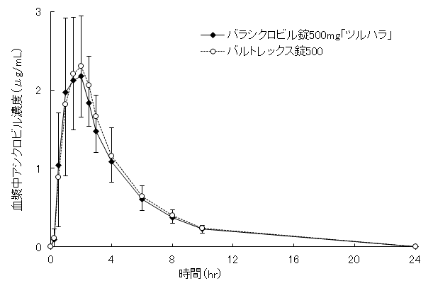 バラシクロビル錠500mg「ツルハラ」とバルトレックス錠500を、クロスオーバー法によりそれぞれ1錠(バラシクロビル500mg)を健康成人男子に絶食時単回経口投与して血漿中の活性代謝物であるアシクロビル濃度を測定し、得られた薬物動態パラメータ(AUC、Cmax)について90%信頼区間法にて統計解析を行った結果、log(0.8)~log(1.25)の範囲内であり、両剤の生物学的同等性が確認された6) 。
