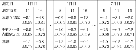 各時間における眼圧と点眼前眼圧との差(mmHg)