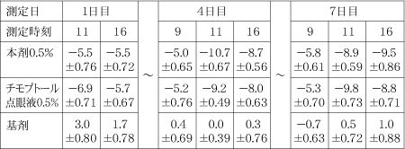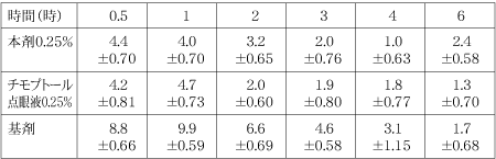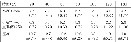 ウサギのα-キモトリプシン惹起高眼圧モデルに対する眼圧下降作用について、本剤0.25%及びチモプトール点眼液0.25%を1日2回1週間点眼投与し、1日3回(午前9時、11時及び午後4時)眼圧を測定した。得られた結果について統計解析を行った結果、両製剤の生物学的同等性が確認された15)。